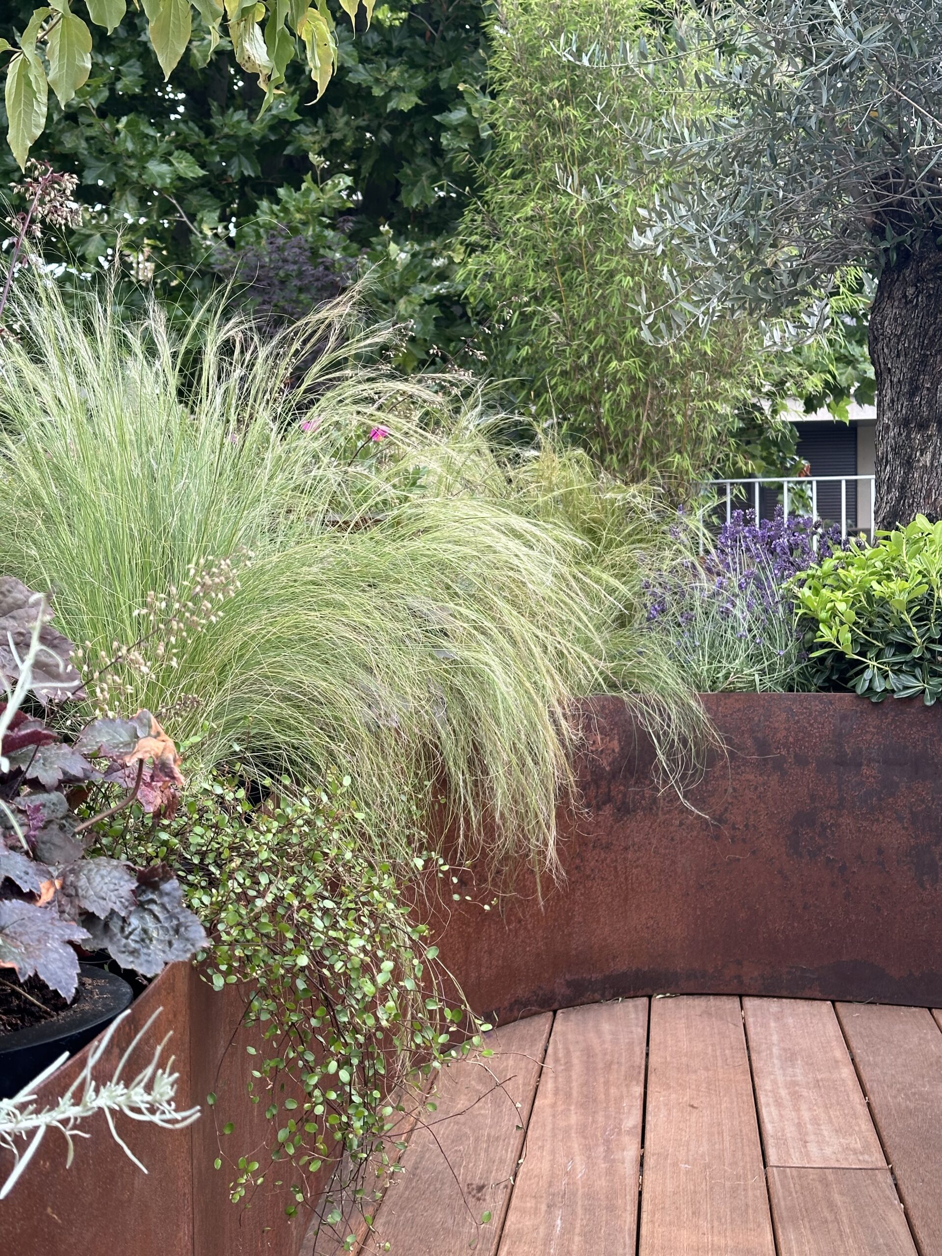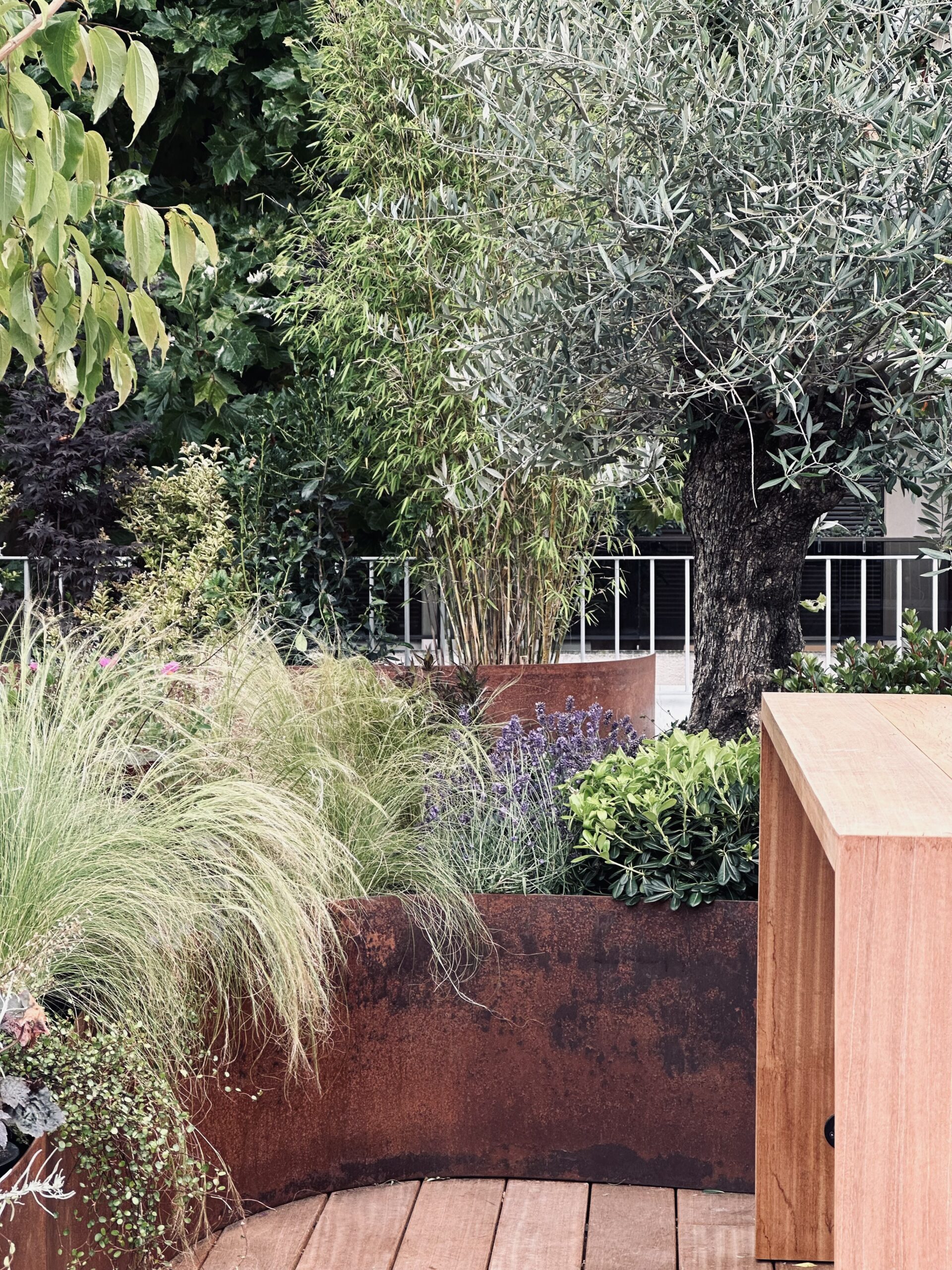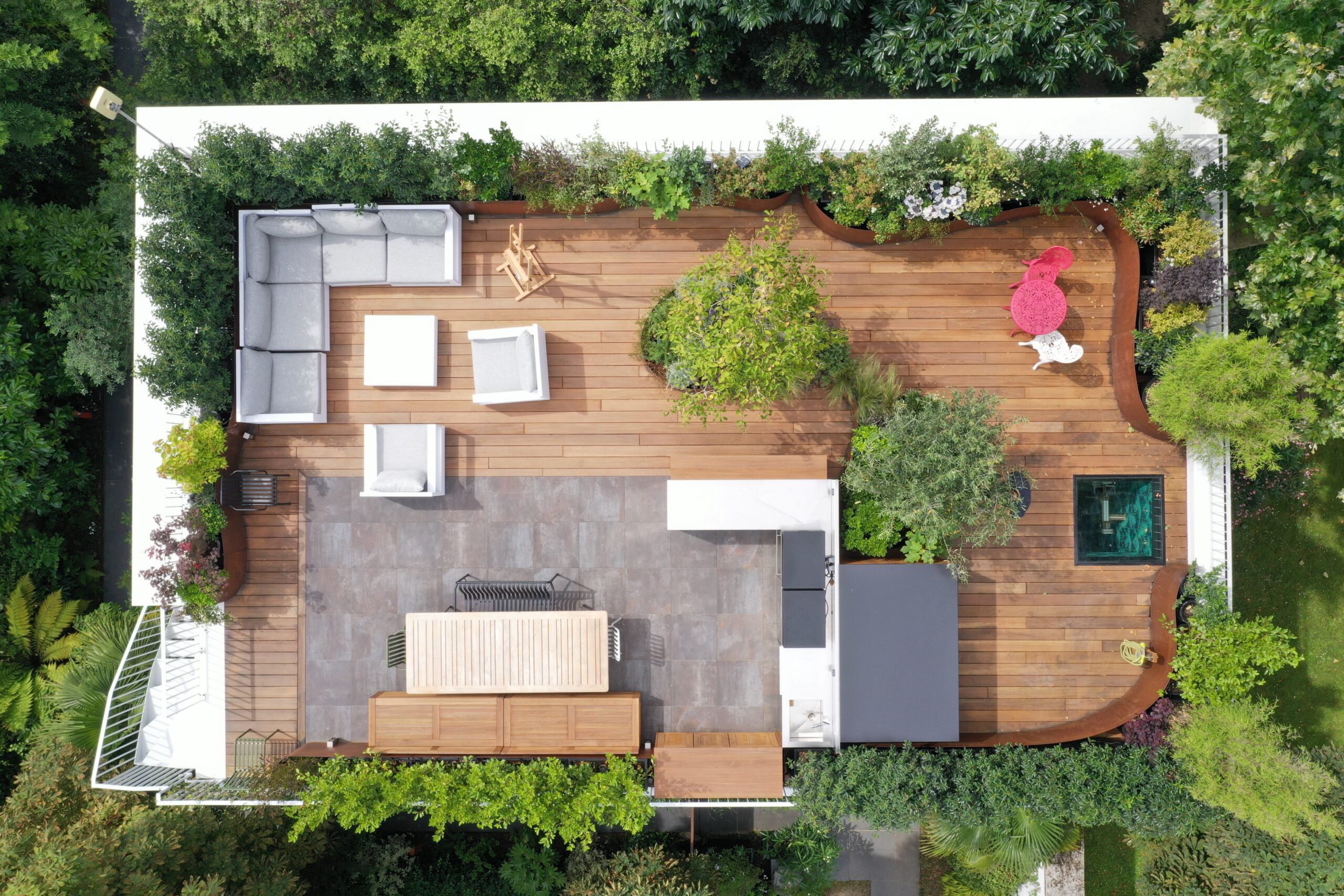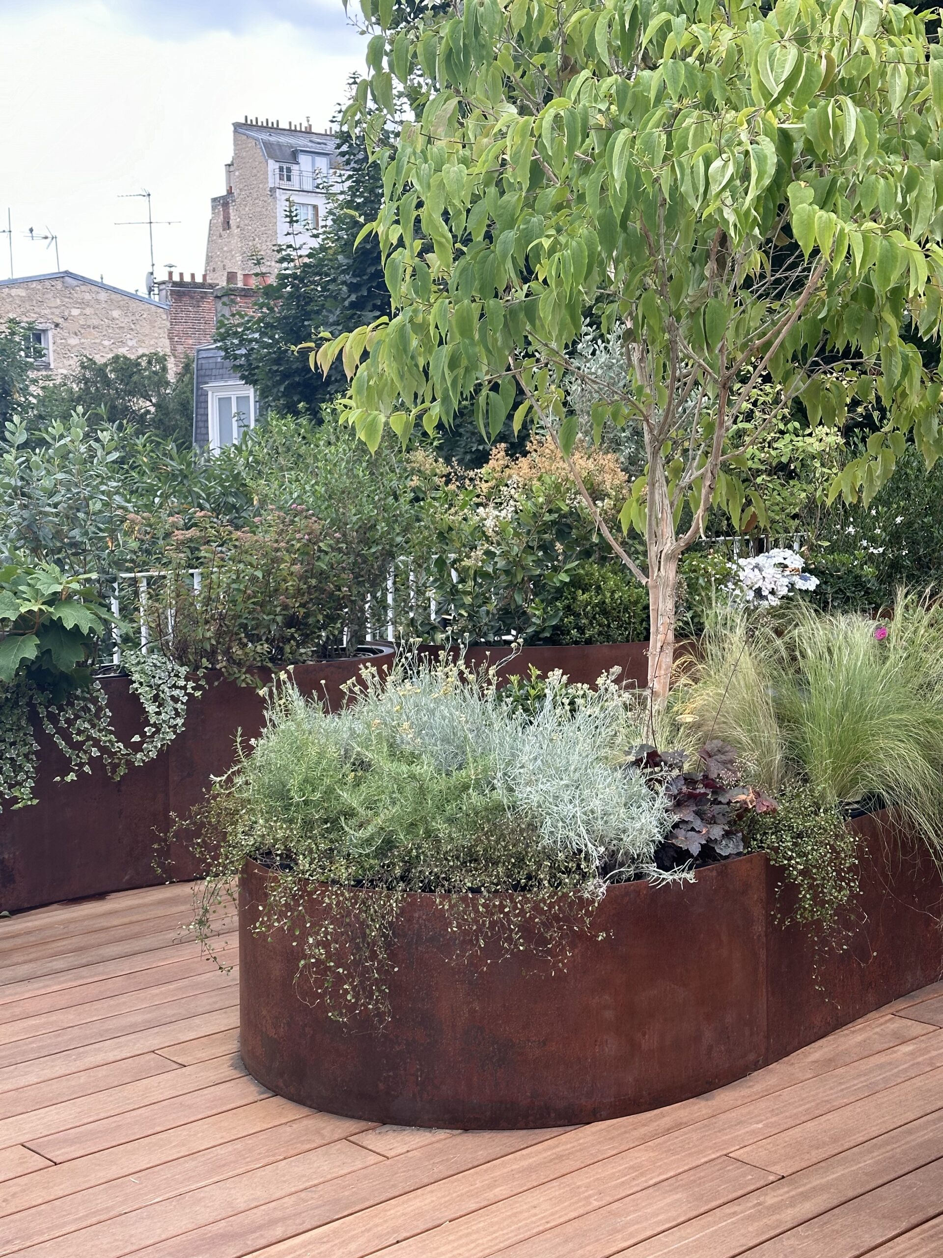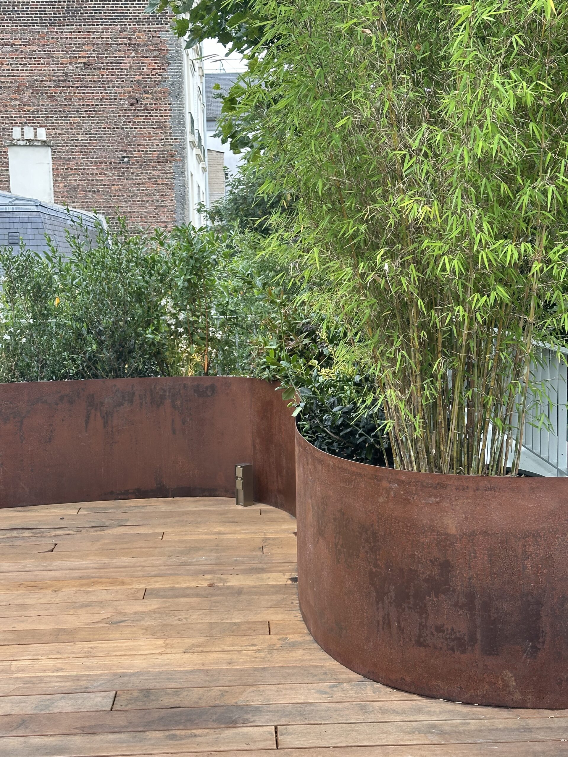 Le projet consistait en l’aménagement d’un toit terrasse. en espace de vie extérieur/ Nous avons utiliser le bois le corten et l’inox pour ce projet.